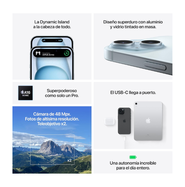 El iPhone 15 incorpora el potente chip A16 Bionic, garantizando una experiencia fluida en redes sociales, multitarea, juegos y aplicaciones exigentes ⚡.